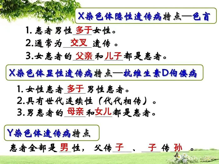 性染色体连锁显性遗传:父母至少有一方为病人,若病人为父亲而母亲正常,仅女儿患与父亲相同的病:反之,儿子、女儿各有一半可能患与母亲相同的病,只是病情上女儿更重。病人家族中可能连续数代有人患病。