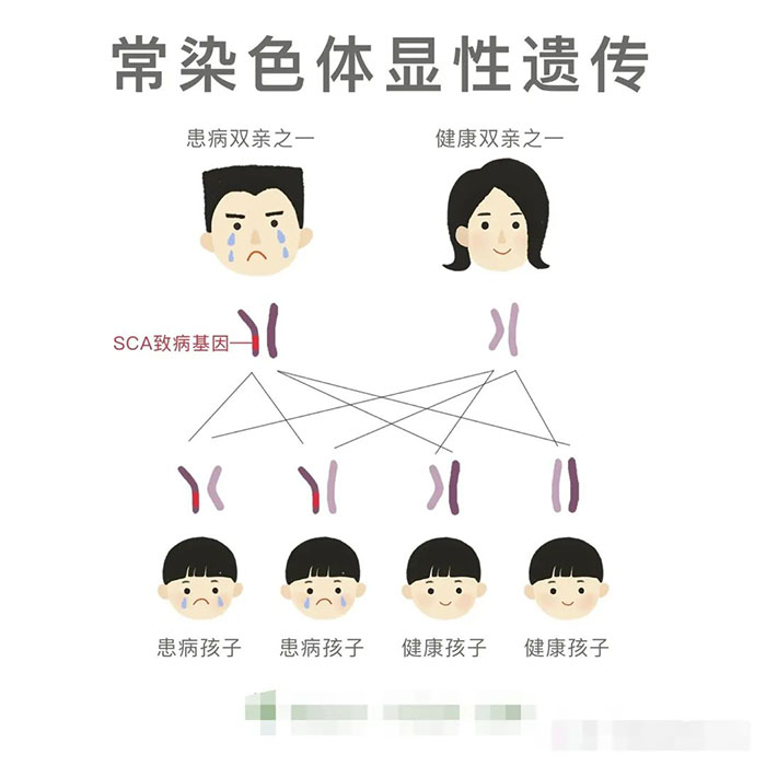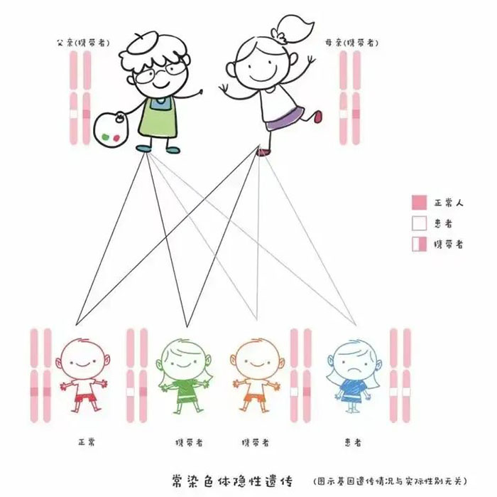 常染色体隐性遗传:父母双方表面正常,但体内均有相同的异常基因,他们婚后生育的子女可能患病。因此,近亲结婚者所生子女患病率高,且没有性别差异,也没有连续几代遗传的现象。