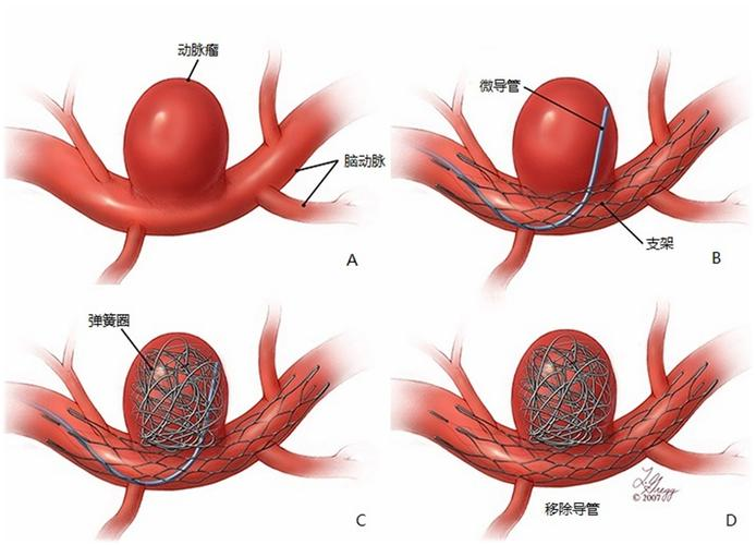 动脉瘤的介入栓塞治疗,简单点讲就是将一根细小的管子放入动脉瘤瘤体内,再通过细小的管子释放栓塞材料将动脉瘤填塞,阻碍血液再流进去,从而防止动脉瘤再出血。